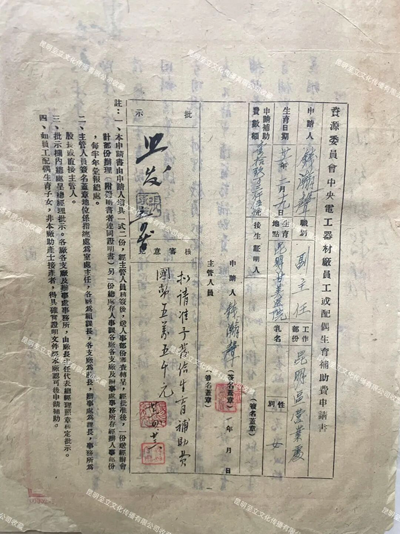▲1947年2月中央電工器材廠(昆明電纜集團前身)發放職工育兒補助國幣55000元。